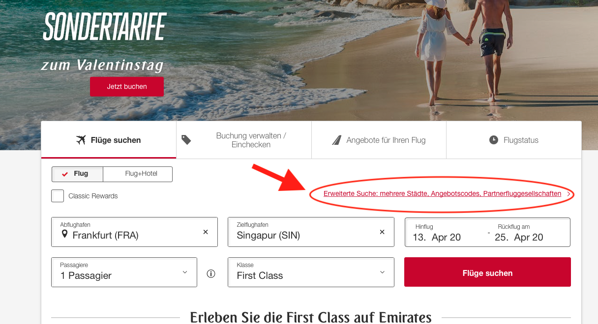 Die Buchung dieses Emirates FIRST Class Error Fares (oder Sonderangebotes?) ist eigentlich sehr einfach und lässt sich direkt über die Emirates Webseite erledigen. Wichtig ist aber, dass Ihr über die „erweiterte Suche“ geht und hier eine Multi- Stop Verbindung wählt.