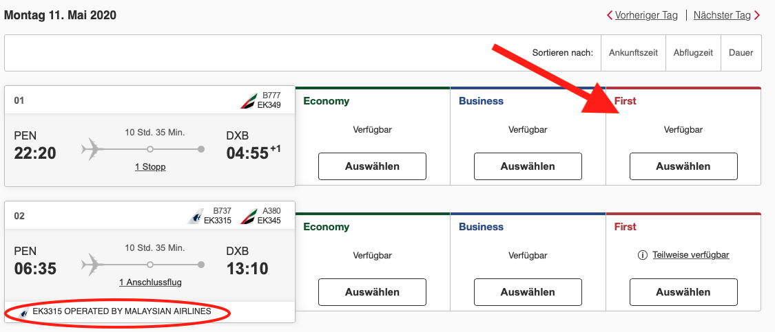 Achtet bei der Flugauswahl darauf, dass Ihr keinen Malaysia Airlines Codeshare Flug habt, sondern nur die Emirates Flüge auswählt.