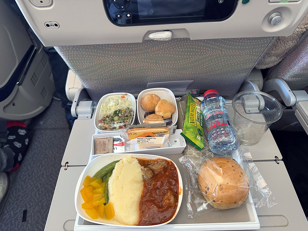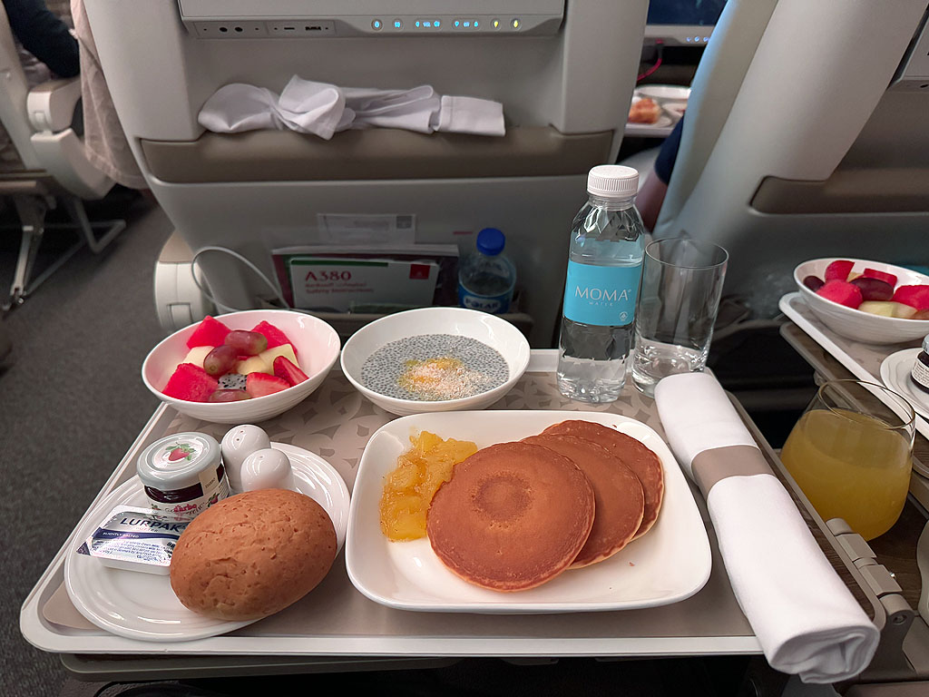 Bei Emirates dürft Ihr Euch in der Premium Economy Class über ein aufgewertetes Essen freuen. Die Portionen der Gerichte sind etwas größer (in den Vergleichsfotos seht Ihr ein Economy Mittagessen und ein Premium Economy Mitternachtssnack sowie die beiden Frühstücke nebeneinander) und wirken durch die Präsentation auf Keramik besser als in einer Aluminiumschale.