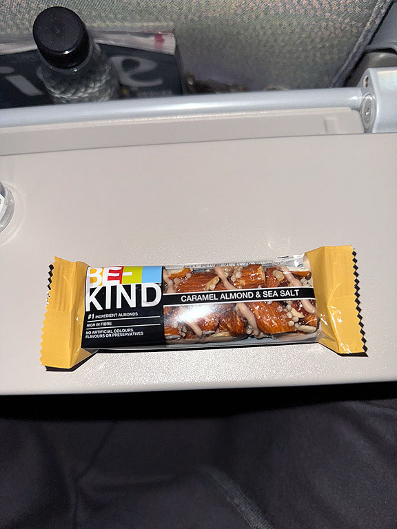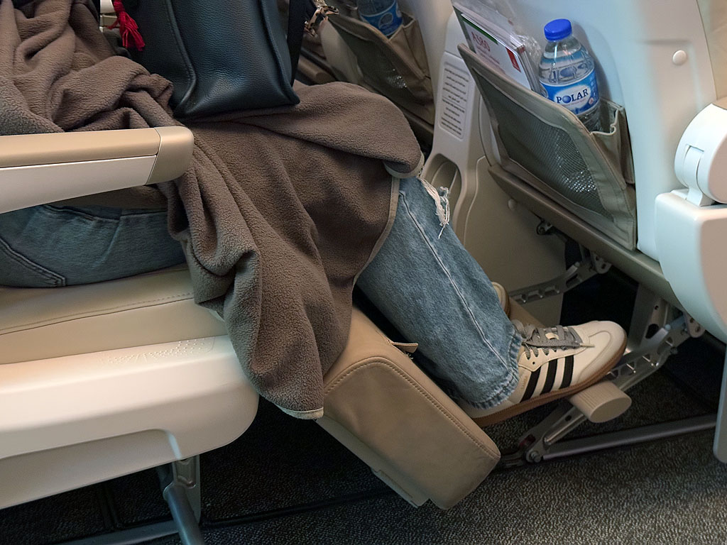 Außerdem gibt es Wasserflaschen am Platz – etwas das in der Economy Class fehlt.