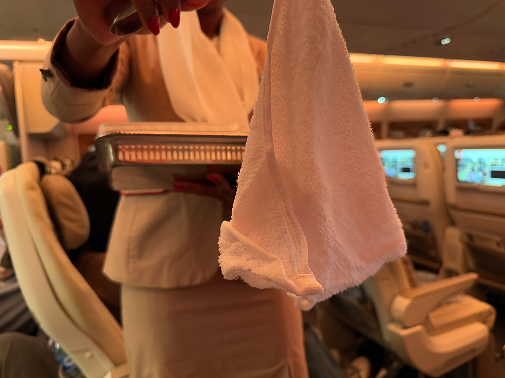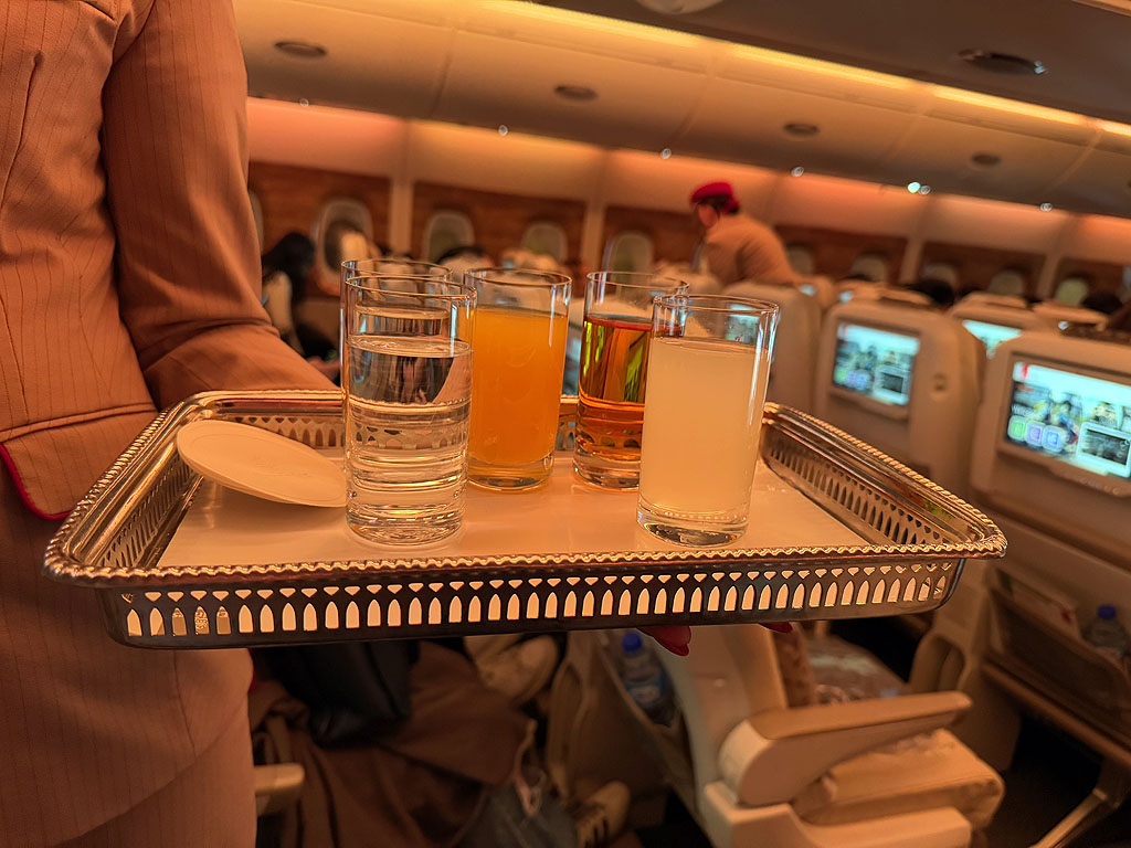 Beim Service hat die Premium Economy Class die Nase ebenfalls vorn. Das liegt daran, dass pro Flugbegleiter weniger Passagiere zu versorgen sind. Und Emirates sorgt dafür, dass die gewonnene Zeit für Service am Passagier genutzt wird. Los geht es mit Begrüßungsgetränken, sobald die meisten Passagiere sich am Platz eingerichtet haben. Dabei servieren die Flugbegleiter Wasser, Apfel- sowie Orangensaft und Limonade aus Gläsern. Noch vor dem Start werden heiße Tücher verteilt.