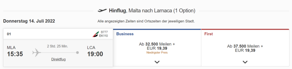 Und wenn Ihr einen weiteren Sweetspot nutzt, dann reist Ihr sogar begleitet von einem Gläschen Dom Perignon in der First Class. Denn in den nächsten Monaten bietet Emirates auch wieder auf der Strecke zwischen Malta (MLA) und Larnaca (LCA) eine First Class an. Dieses Reiseerlebnis kostet Euch in der First Class nur 37.500 Meilen und knapp 20 Euro Zuzahlung. Günstiger kommt Ihr nicht in die First Class von Emirates.