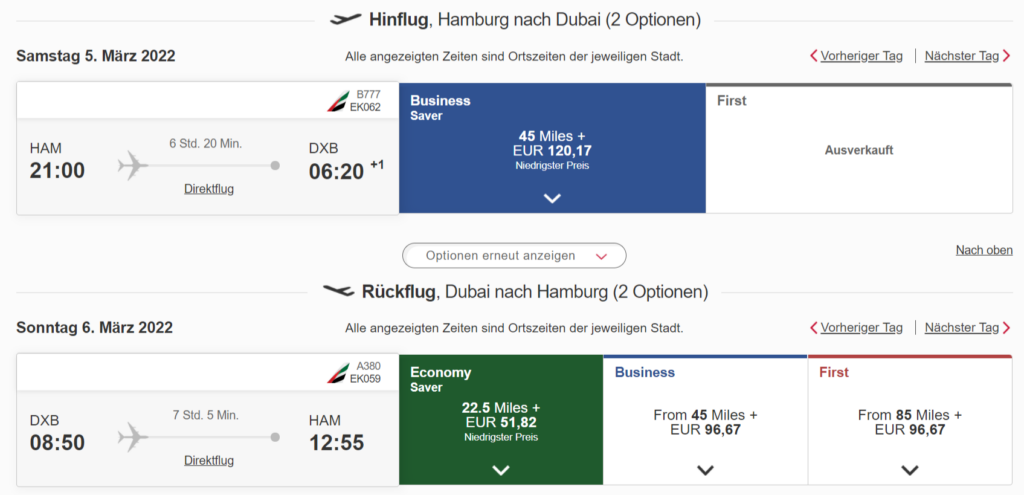Dabei ist ein Business Class Rundflug von Düsseldorf, Frankfurt oder Hamburg nach Dubai und zurück mit 90.000 Skywards nur unwesentlich teurer als ein Oneway-Flug. Bucht Ihr eine Strecke in Business Class und eine in Economy Class, spart Ihr sogar 5.000 Meilen gegenüber dem Oneway und habt noch einen zusätzlichen Flug in der Economy Class.
