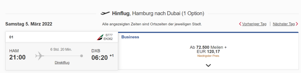 Diese 72.000 Meilen reichen auch nach dem neuen Preis noch für einen Business Class Flug von Deutschland nach Dubai (die 500 fehlenden Meilen erreicht Ihr einfach über den Mindestumsatz). Nutzt Ihr den Trick mit dem Economy Class Rückflug, reichen die Meilen locker aus.