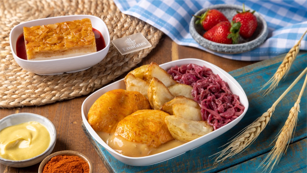 In der Economy Class können die Passagiere zum Beispiel eine Hähnchenbrust mit Senfsauce, Kartoffelecken und Rotkohl bekommen, sowie einen traditionellen Bienenstich als Dessert.