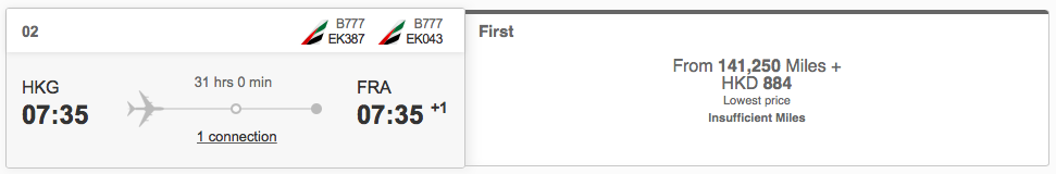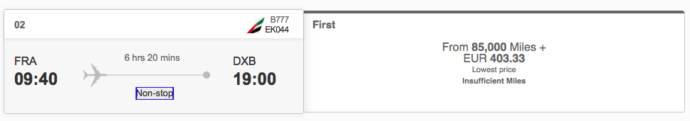 Hier liegen die Meilenwerte für einen Flug zwischen Frankfurt und Dubai, auch in der neuen Emirates First Class, bei 85.000 Meilen für den One Way oder 135.000 Meilen für den Hin- und Rückflug.