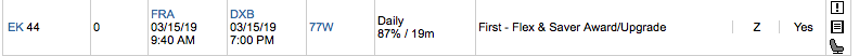 Für alle die über Expertflyer suchen, die Emirates First Class Prämienflüge (oder Upgrades) buchen in die Buchungsklasse Z. Auf Flügen mit der neuen Emirates First Class findet Ihr zwar recht zuverlässig Verfügbarkeiten, aber erst 48 Stunden vor dem Abflug. Hier findet man dann sogar oft zwei Plätze auf Meilen in der neuen Emirates First Class.