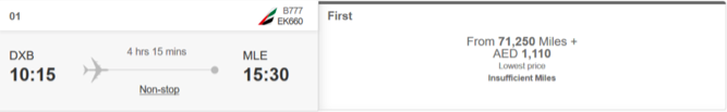 Leider sind die verhältnismäßig kurzen Flüge zwischen Dubai und den Malediven alles andere als ein Sweet Spot im Emirates Skywards Programm. Hier wird für den One Way Flug in der neuen (und auch alten) Emirates First Class ein Preis von 71.250 Meilen und 270 Euro an Steuern und Gebühren aufgerufen.