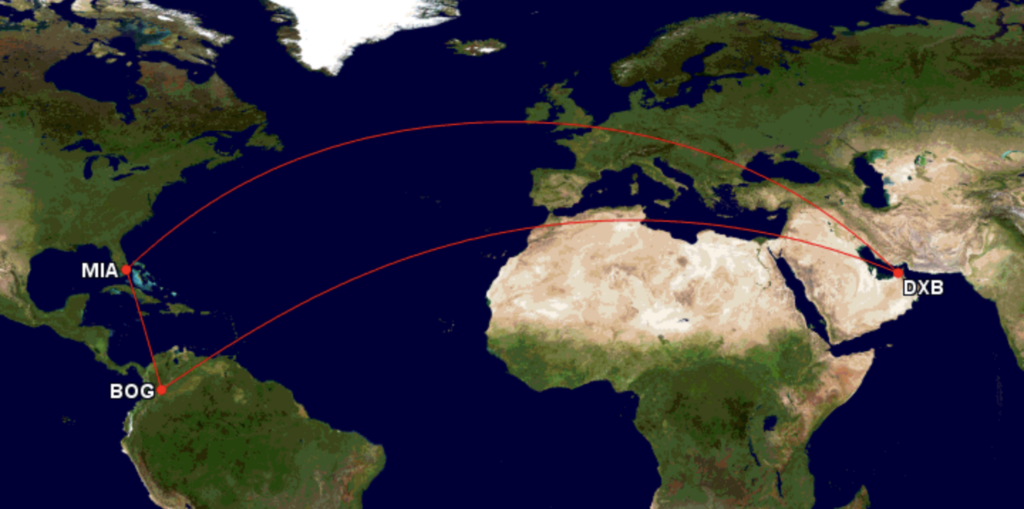 Dabei wäre ein non stop Flug von Dubai nach Bogota theoretisch möglich und die Boeing 777-200LR könnte die Strecke non Stop fliegen. Allerdings befindet sich Bogota über 2.600 Meter über dem Meeresspiegel, was zumindest beim Rückflug von Bogota nach Dubai zu Problemen führen würde. Hier wäre wohl nicht mehr die komplette Nutzlast der Boeing 777-200LR möglich und ein technischer Stop wäre zumindest auf dem Rückweg nötig.