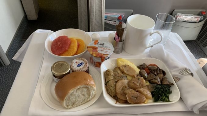Zu den Mahlzeiten in der Business Class gehören eine Auswahl an vom Küchenchef zubereiteten Gerichten wie Schokoladen-Haselnuss-Pfannkuchen mit Aprikosenkompott und Ricotta-Sauerrahm zum Frühstück, Rinderfilet mit Thymianjus, gerösteten Kartoffelspalten und gedünstetem Gemüse zum Mittagessen sowie gebratene Lachsforelle mit Safrancreme. zum Abendessen blanchierte grüne Bohnen, geschmorte Rote Bete und Polenta mit Frühlingszwiebeln.