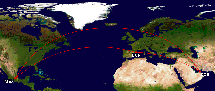 Von Dubai nach MEX könnte Emirates sogar non stop Fliegen, allerdings den Rückweg nicht. Das Aufkommen zwischen Barcelona und Mexico Stadt ist hier sicherlich eine große Motivation für Emirates.