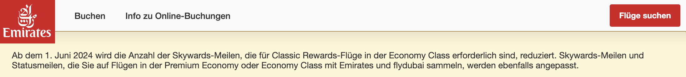 Den Hinweis über die Veränderung finden Vielflieger auf der Homepage von Emirates. Die Teilnehmenden werden dort über die Reduzierung der Meilenwerte informiert, man geht aber nicht ins Detail. Betroffen sind auch die Gutschriften der Mitgliedsairline flydubai.