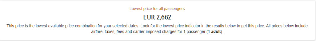 Nehmen wir als Beispiel einen Hin- und Rückflug in der Business Class von Frankfurt nach Dubai. Die Reise beginnt am 7. November 2024 in Frankfurt, der Rückflug ist am 14. November von Dubai. Der günstigste Tarif für diesen Flug beträgt 2.662 Euro.