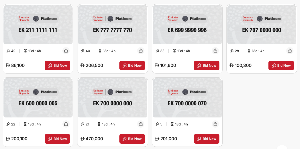 Emirates hat dieses Konzept nun auf die Vielfliegernummern übertragen und versteigert folgende „schöne“ Skywards-Nummern: