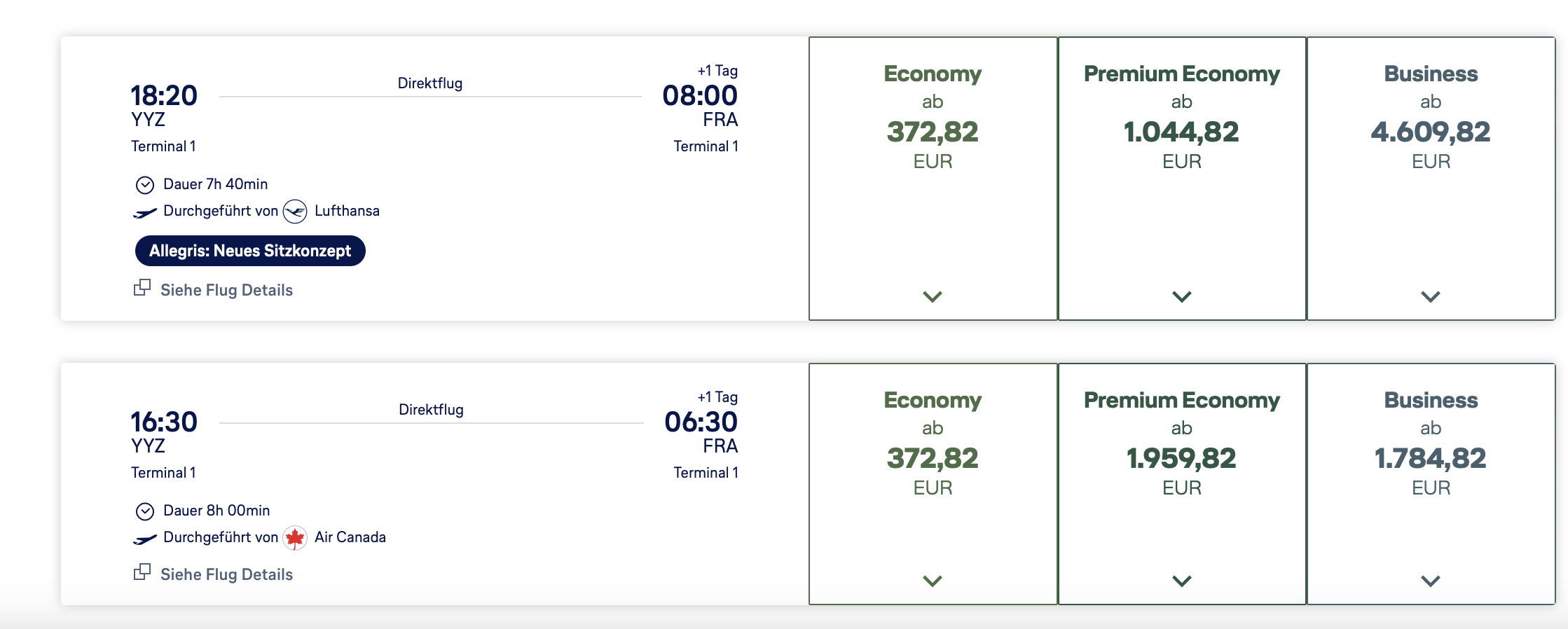 Da Lufthansa auf diesen Flügen nur vier Business-Class-Sitze überhaupt verkaufen kann, sind die Preise hier auch sehr hoch angesetzt, da man quasi nur Full-Fare-Tickets erwerben kann. Dies hat zur Folge, dass der zweite Flug des Tages von Air Canada zwischen Frankfurt und Toronto meist deutlich günstiger verkauft wird.
