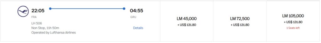 Gleichzeitig scheint es jedoch auch Anpassungen der Meilenwerte nach unten gegeben zu haben. So haben sich Prämienwerte für Flüge von Deutschland nach Brasilien verbessert. In der Business Class spart ihr jetzt 7.250 Meilen und in Economy sowie First immerhin 5.000 Meilen.