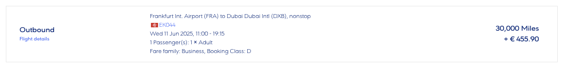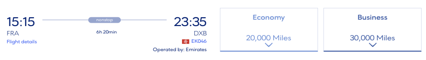 Der Preis für einen Prämienflug von Europa in die Golfregion beträgt 40.000 Meilen, die Business Class gibt es für 60.000 Meilen. Eine Oneway-Flug kostet entsprechend nur die Hälfte, das bedeutet, Ihr könnt für 30.000 Meilen von Frankfurt nach Dubai fliegen. Neben den bisherigen Optionen wie z.B. mit Lufthansa oder Swiss geht das jetzt auch mit Emirates: