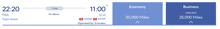 Bei Miles+Bonus gibt es einen weiteren Vorteil: Die Meilenpreise werden unabhängig des Routings berechnet. Das gilt auch dann, wenn der Umstieg in einer anderen Region stattfindet. Konkret bedeutet, dass bei einem Flug von Deutschland über Dubai zu einer anderen Destination in Europa nur ein Trip innerhalb von Europa abgerechnet wird. Leider erhöhen sich die Gebühren entsprechend. Online haben wir u.a. diese Möglichkeit von Frankfurt via Dubai nach Zypern gefunden: