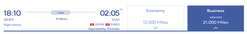Es lohnt sich also schon fast, noch weiterzufliegen. Spannend wird es, wenn Ihr in der Golfregion bleibt, da sich der Meilenpreis nicht verändert. Wenn Ihr beispielsweise von Frankfurt über Dubai nach Muscat weiterfliegt, bleibt es bei den 30.000 Meilen in der Business Class. Der Anschlussflug sowie der Aufenthalt in der Emirates Business Class Lounge sind inklusive: