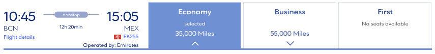 Je nach Strecke und Zielort relativiert sich die Zuzahlung. Interessant sind hier einige Anschlussflüge ab Dubai oder die sogenannten 5th-Freedom-Flights. Dabei handelt es sich um Strecken, die nicht den Heimatflughafen von Emirates berühren. Darunter sind die Flüge zwischen Bangkok und Hongkong, Rio und Buenos Aires oder Mailand und New York. Interessant ist auch die Verbindung von Barcelona nach Mexico City, der Preis für einen oneway Flug in der Business Class liegt bei 55.000 Meilen plus etwa 125 Euro.