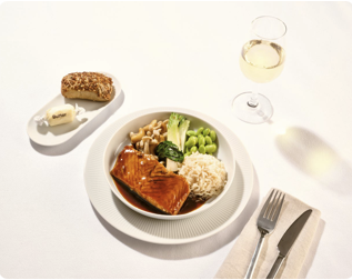 - Teriyaki-Lachsfilet | Buchenrasling | Pak Choi | Edamame | Miso-Reis