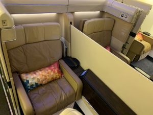 Eine Sache, welche mich an dem Sitz ein wenig gestört hat war, dass er mit Leder bezogen war und entsprechend nicht geatmet hat. Auch wenn der Ledersessel sehr hochwertig aussieht, bevorzuge ich ohne Frage einen Sessel, der mit Stoff bezogen wurde, wie es in den meisten First Class Kabinen der Fall ist.