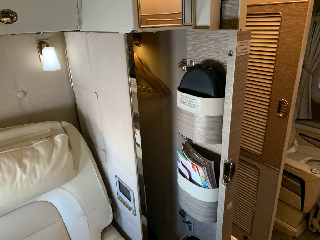 Eine weitere Sache, welche mich bei der neuen Emirates First Class Suite ein wenig überrascht hat, war das Fehlen von Stauraum. So gab es unzählige Fächer und Ablagen, welche allerdings alle mit Equipment des Flugzeuges belegt waren. Hier waren Fernglas, Kopfhörer und diverse Snacks verstaut, aber persönliche Gegenstände konnte man nur auf dem riesigen Tisch vor sich ablegen.