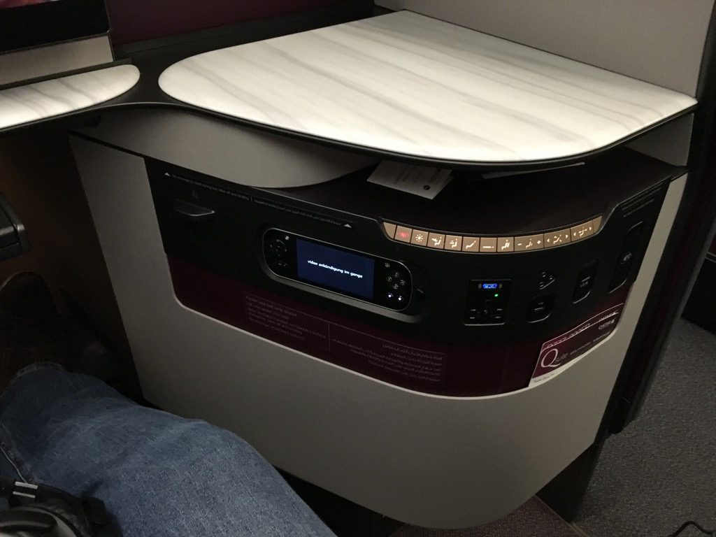 Hier haben wir auch den ersten Fehler gemacht und uns zwei zugewandte Sitze am Fenster geben lassen. Ich ging davon aus, dass man hier auch, wie bei den vierer Suiten in der Mitte den Fernseher verschieben kann und sich hierdurch ansehen kann. Dies ist leider nicht so. Für ein Paar sind diese Plätze damit nicht Ideal, aber 6 Stunden nach Doha schafft man auch ohne Körperkontakt. Wir waren wohl nicht die einzigen, denen es so erging, denn ich habe einige Paare gesehen, welche sich über die Wände hinweg unterhalten haben.