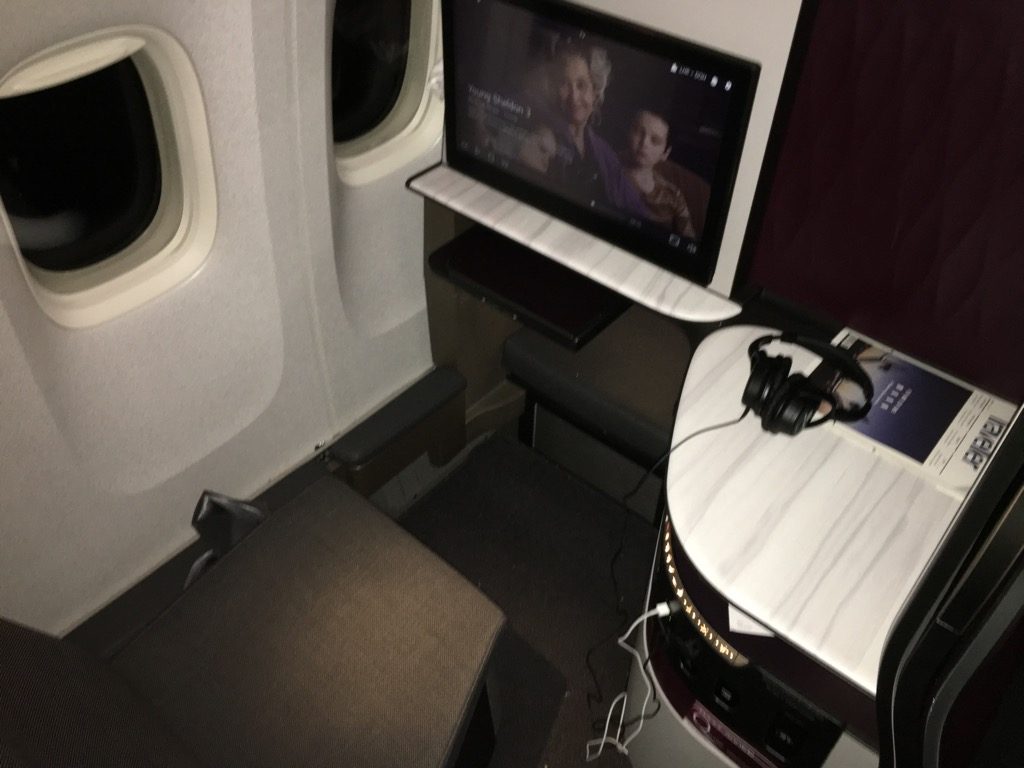 Extrem positiv, empfand ich die viele Ablageflächen, welche man in der QSuite hat. Hier hatte ich wirklich nie das Gefühl, dass es mir an Stauraum fehlt. Insgesamt war die Qatar Airways QSuite auch extrem geräumig und wirkte auf mich deutlich größer, als ich ursprünglich erwartet habe. Man fühlte sich hier tatsächlich wie in einer First Class Suite, wie z.B. in der Asiana First Class im Airbus A380, mit allen Vor- und Nachteilen, wie der hohen Privatsphäre und dem möglicherweise etwas klaustrophobieschem Gefühl.