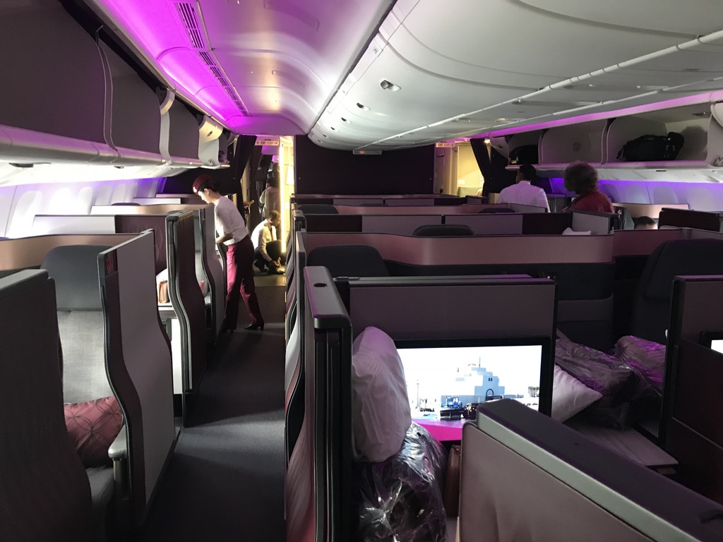 Beim Boarding wurden wir freundlich von den vielen herumwuselnden Flugbegleiterinnen begrüßt und von der für uns zuständigen Flugbegleiterin zu unseren Plätzen begleitet. Die Kabine der Qatar Airways QSuite wirkt tatsächlich wie eine überdimensionale First Class Kabine, was auch maßgeblich an den Türen und gut abgeschotteten Sitzen liegt.