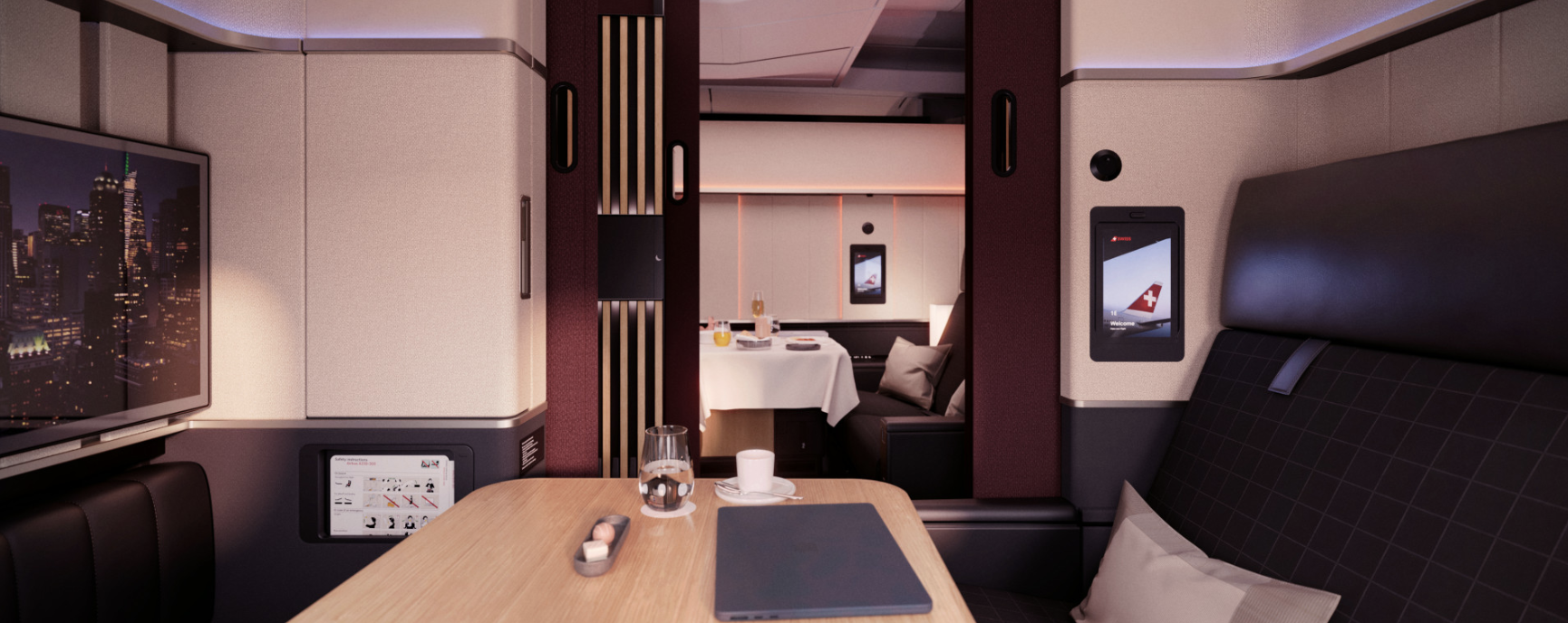 Die neuen SWISS First Suites bieten Fluggästen absolute Privatsphäre mit verschließbaren Schiebetüren, persönlicher, geräumiger Garderobe, großem Esstisch, Sitzheizung und -kühlung, kabellosem Lademodul sowie Bildschirmen über die gesamte Suitenbreite hinweg.