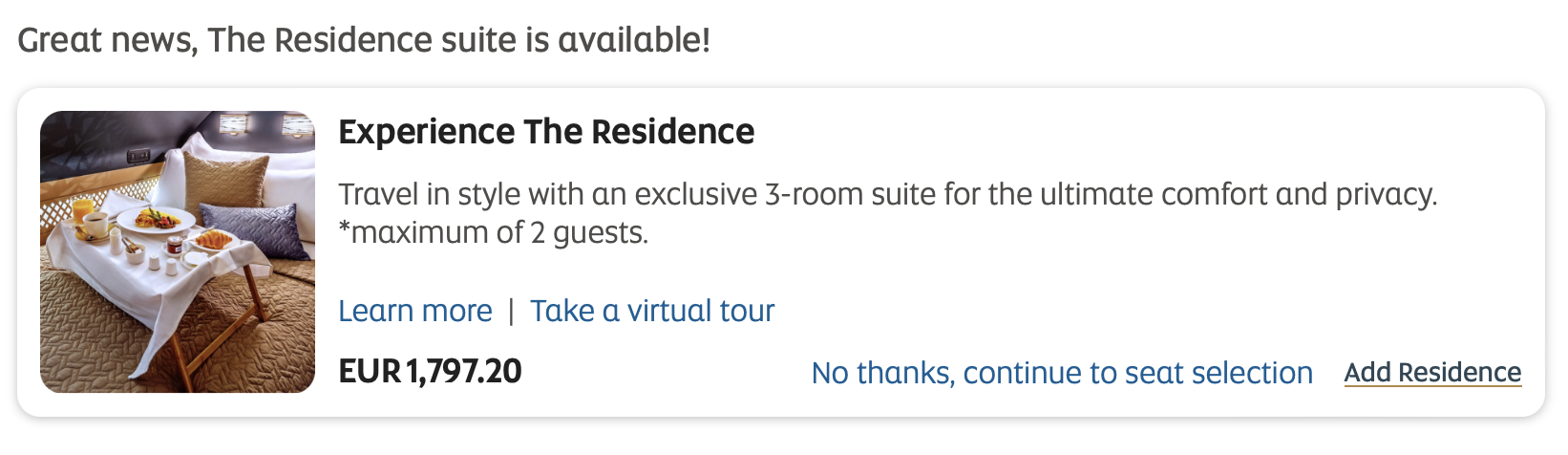 Eine weitere Besonderheit des Etihad Airbus A380 ist die sogenannten „The Residence“. Dieser eigene Teil der First Class Kabine inklusive privatem Schlafzimmer und Badezimmer war einmal als „Ultra First Class“ konzipiert und ein Flug hier kostete meist einen mittleren fünfstelligen Betrag. Inzwischen hat man hier aber eine deutlich humanere Preispolitik gefunden und man kann das Upgrade auf der Strecke von Singapur nach Abu Dhabi (oder in der Gegenrichtung) für 1.797,20 Euro buchen (etwa 2.000 USD).