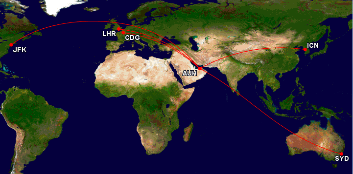 Das Streckennetz der Etihad Airways Airbus A380 ist recht überschaubar, was insbesondere daran liegt, dass man das Flugzeug auf den längsten Etihad Airways Flügen einsetzt und auch, dass man z.B. nach London gleich drei mal pro Tag den Super Jumbo fliegt.