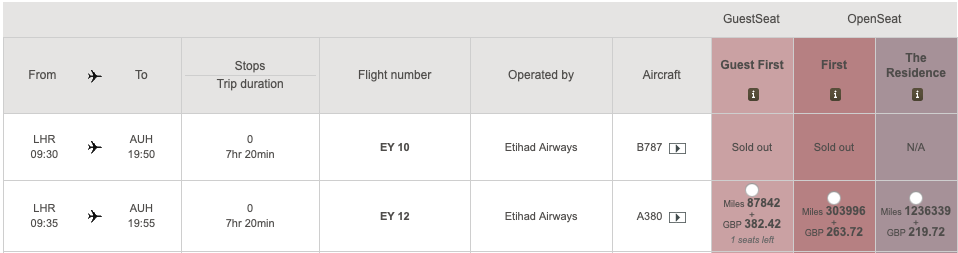 Neben den Guest First Plätzen, welches die Prämienflüge sind die Ihr sucht, wird Euch auch eine First Prämie angeboten, welche bei deutlich mehr Meilen alle First Class Sitze verfügbar macht oder auch die Residence, was eine ganz eigene Flugerfahrung ist, allerdings mit weit über 1 Millionen Meilen alles andere als günstig.