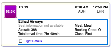 Folgende Meilenwerte erhebt American Advantage für einen one way Prämienflug in der Etihad First Class im Airbus A380 Apartment von und nach Abu Dhabi.