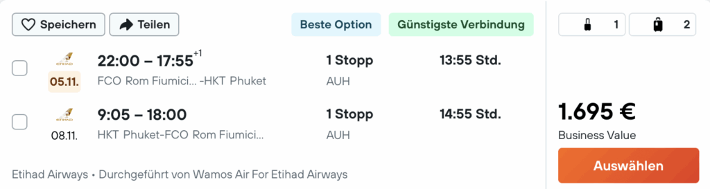Schon zum wiederholten Mal dieses Angebot ab Rom….wollen die Römer nicht Etihad Biznes fliegen oder gilt das Angebot nicht wenn man in Italien bucht? immerhin hat sich die Ankunftszeit in BKK verbessert.