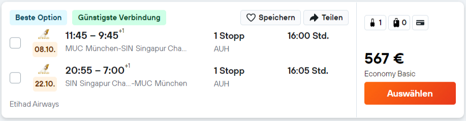 Dieser Deal ist ideal für preisbewusste Reisende, die Wert auf Qualität und Service legen, aber nicht zu viel Geld ausgeben möchten. Es ist besonders geeignet für flexible Reisende, die sich mit Handgepäck arrangieren können oder bereit sind, für Aufgabegepäck einen Aufpreis zu zahlen. Wer ohnehin vor hat, im Herbst oder frühen Winter nach Singapur zu reisen, sollte sich dieses Angebot nicht entgehen lassen. Der Preis ist für die Qualität, die Etihad bietet, sehr gut!