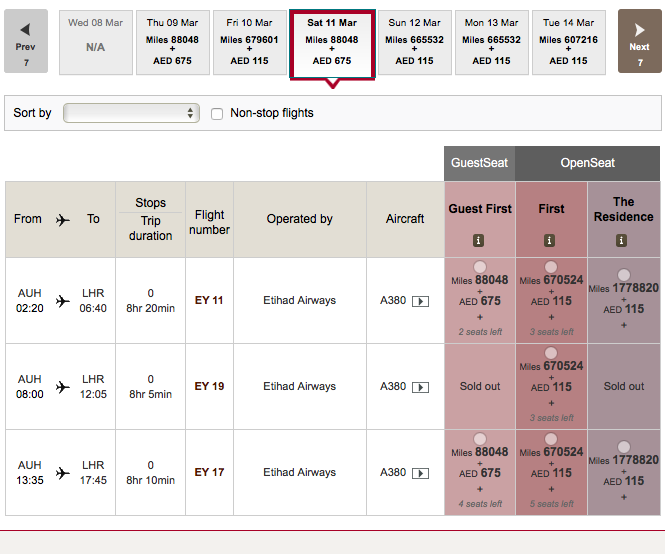 Etihad Guest ist die naheliegendste Option, um eine Flug in den Etihad Apartments zu buchen. Das Buchen ist auch entsprechend einfach, da man die Flüge einfach über die Webseite buchen kann. Dabei benötigt man bei Etihad Guest folgende Meilenwerte für den einfachen Flug.