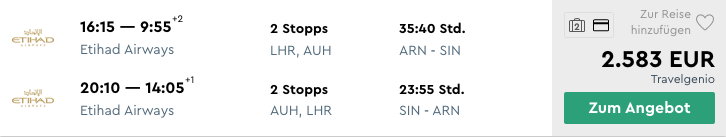 Besonders spannend ist natürlich Singapur. Hier kann man direkt die Etihad First Class Apartments im Airbus A380 mit der Etihad First Class im Boeing 787 Dreamliner vergleichen, oder auch ein Flug nach Sydney. Für 4.500 Euro erhält man hier über 40 Stunden in den Etihad First Class Apartments, also zahlt man nur etwas über 100 Euro pro Flugstunde ;).