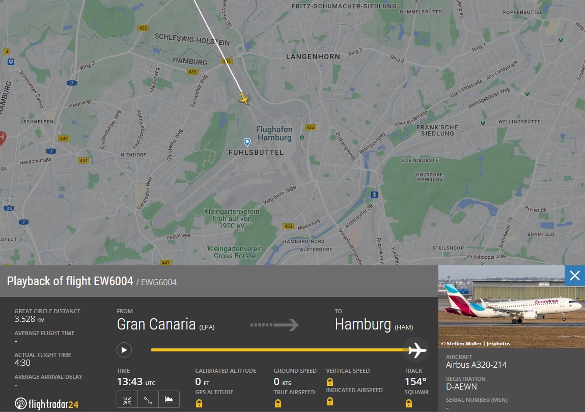 Den gesamten Flug EW6004 von Gran Canaria nach Hamburg könnt Ihr bei Flightradar24.com nachverfolgen.