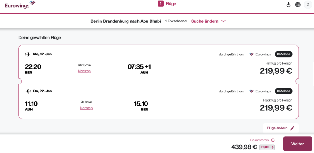 Abu Dhabi ist dabei trotz seiner direkten Nähe zu Dubai deutlich anders als die mega Metropole und dennoch alles andere als langweilig. Wirklich spannend werden die Flüge von Eurowings ab Berlin nach Abu Dhabi aber auch über den Preis in der BIZ Class, denn hier kann man den Hin- und Rückflug schon ab 439 Euro buchen, was ein wirklicher hammer Deal ist.