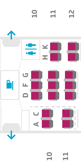 Die besten Plätze befinden sich wieder dort, wo es keine Vorderreihe gibt, nämlich in der Reihe 7 in der Mitte (7D, 7E, 7G) sowie außen in Reihe 8 (A&C, H&K). Vor den Reihen außen befindet sich ein Notausgang, so dass es dort etwas kühler werden kann.