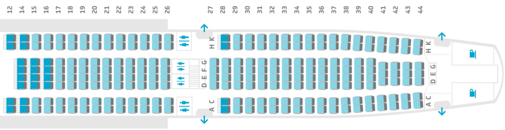 Die besten Plätze finden sich hinter der ersten Trennwand (der zur Premium Economy). In der Mitte ist das Reihe 14 mit XXL-Beinfreiheit. Etwas weniger Beinfreiheit gibt es dann außen in den Reihen 12 (A&C, H&K).