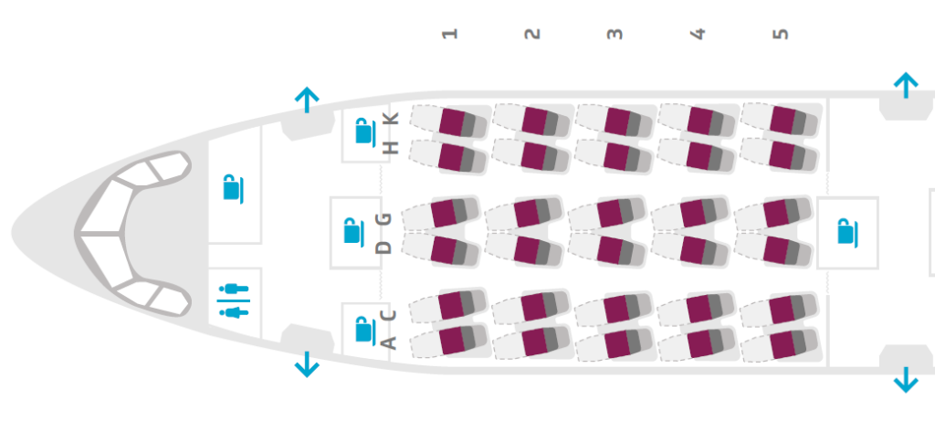 Für Alleinreisende sind insb. die „Thronsitze“ interessant, welche sich in den Reihen 1, 3 und 5 (A) befinden. Danach kommen dann die einzelnen Fenstersitze auf der rechten Seite. Ob man lieber am Fenster oder am Gang sitzt, ist dabei wieder Geschmackssache. Näher am Fenster befinden sich die Plätze in den geraden Reihen (2K, 4K und 6K)