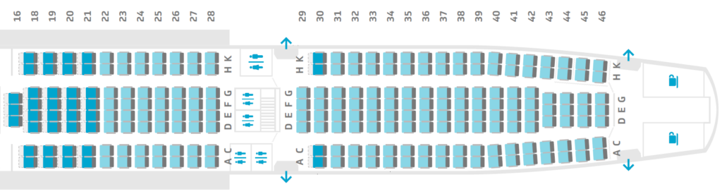 In Reihe 28 (A&C und H&K) gibt es noch Plätze am Notausgang. Hier hat man zwar jede Menge Beinfreiheit, jedoch fühlt man sich dort hin und wieder etwas kälter als in anderen Teilen des Flugzeugs. Und die Toiletten sind nicht allzu fern, was je nach Flug zu viel Verkehr auf dem Gang oder Wartschlangen in Sitznähe führen kann.