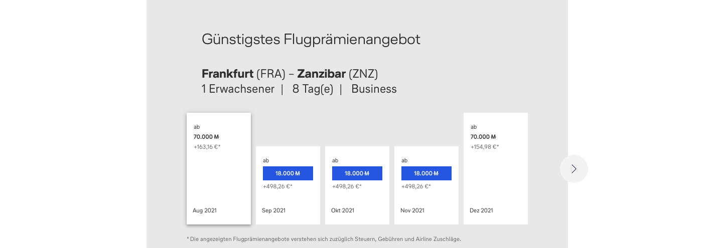 Klickt man aber einen Monat an, kann man die Reisetage und die Reiseklasse eingeben und bekommt im Falle von Sansibar direkt einige Meilenschnäppchen in der Übersicht angezeigt.