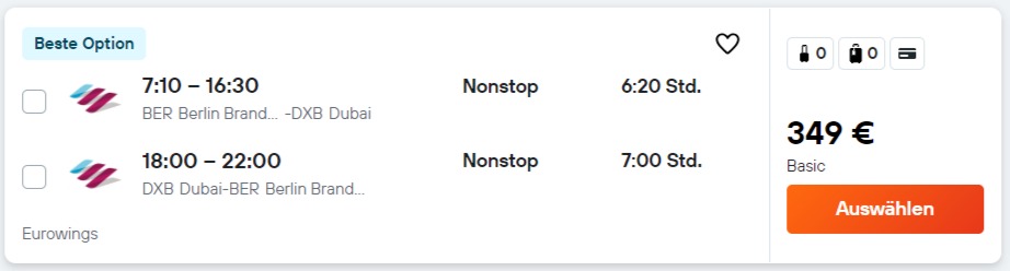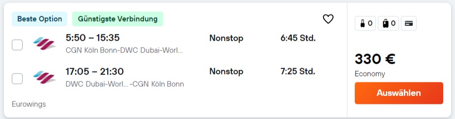 Um die Schmerzen etwas zu lindern, hat Eurowings nun aber an einigen Terminen von November 2024 bis Januar 2025 Angebotstarife geladen. Damit könnt Ihr ab dem Flughafen Köln-Bonn (CGN) bereits ab 330 Euro in die Vereinigten Arabischen Emirate und wieder zurück fliegen. Ab Berlin-Brandenburg (BER) wird es nur unwesentlich teurer.