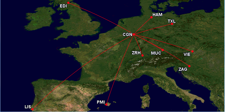 Trotz der Nähe zu Düsseldorf, bietet Eurowings auch ab Köln- Bonn insgesamt neun Strecken ab dem 1. Juni an. Dies liegt auch sicher an dem enormen Ballungsraum in der Region, wobei sich nicht alle Ziele mit Düsseldorf überschneiden.