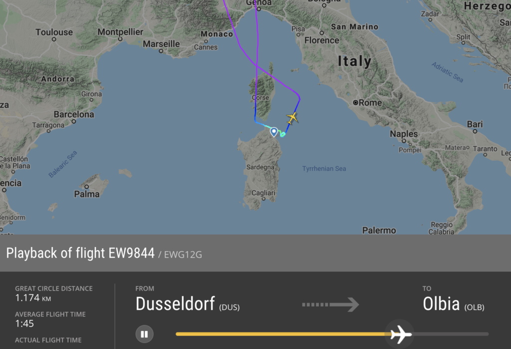 Die Flugzeit von Düsseldorf nach Olbia beträgt in der Regel etwas weniger als zwei Stunden. Nach dieser Zeit war der Airbus A320 mit der Kennung D-AEWJ auch schon über der Insel. Bei Flightradar kann man beobachten, wie die Maschine dort über einige Zeit Warteschleifen dreht.