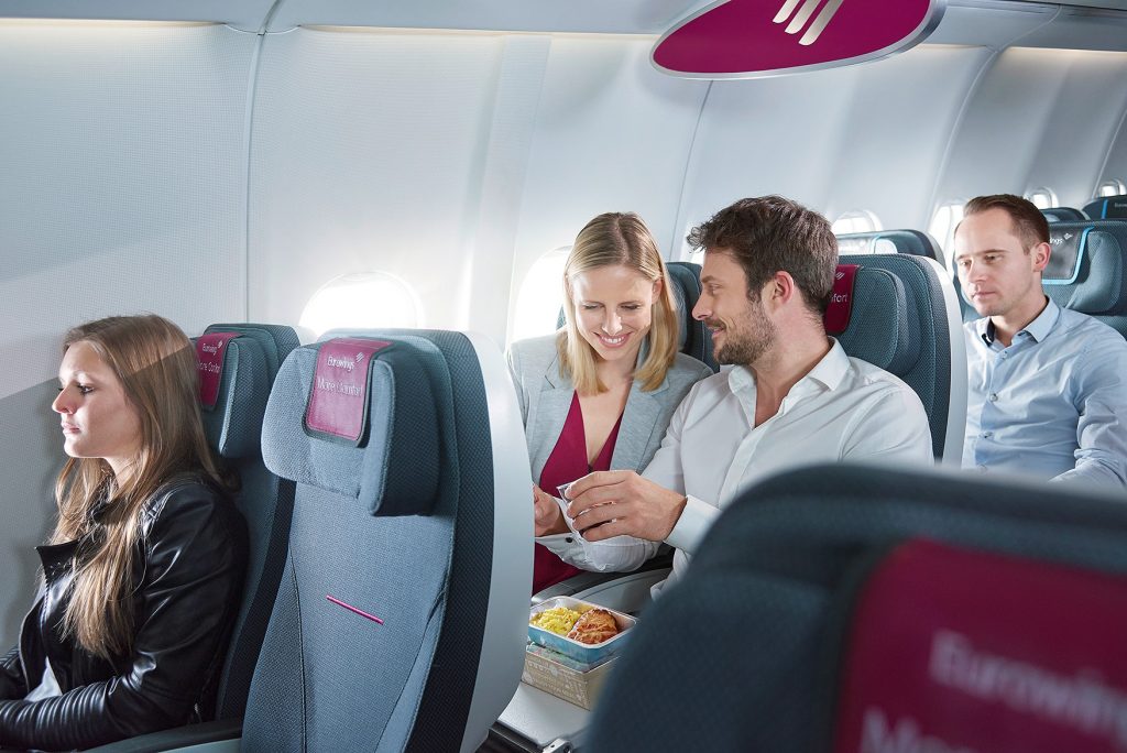 Die Eurowings Meilenschnäppchen in der Economy Class buchen nicht in den billigsten BASIC Tarif, sondern im Grunde in den SMART Tarif. So könnt Ihr an einen Koffer bis 20 Kilogramm kostenlos aufgeben und auch an Bord müsst Ihr für Mahlzeiten und Getränke nichts extra bezahlen.